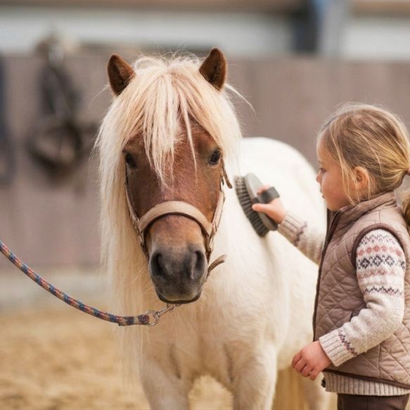 Our pony Trixi is calm, patient, and loves children. Many children are cautious at first, but after just a few minutes they’re already feeling quite proud. That’s exactly why pony leading and riding are perfect.