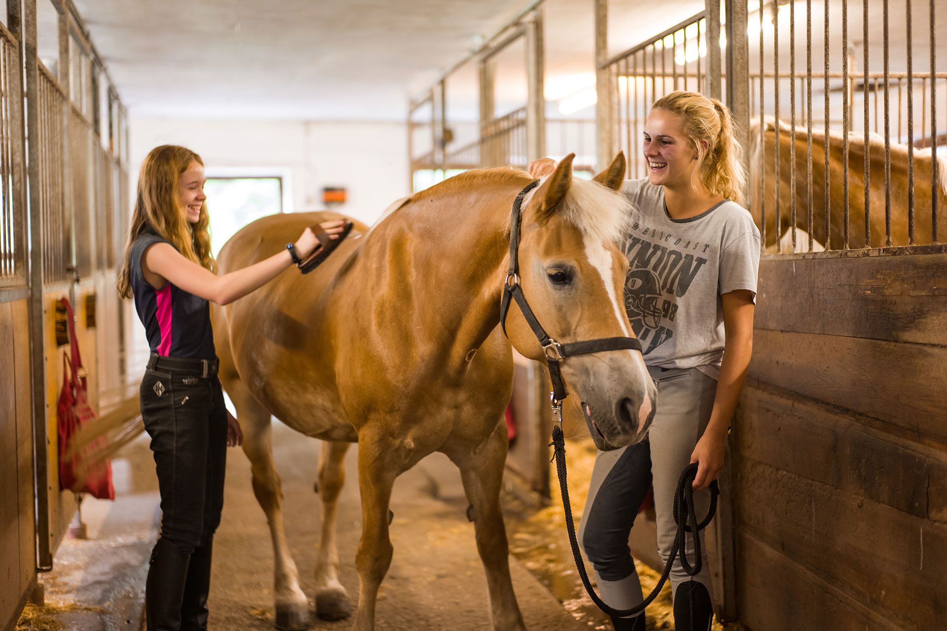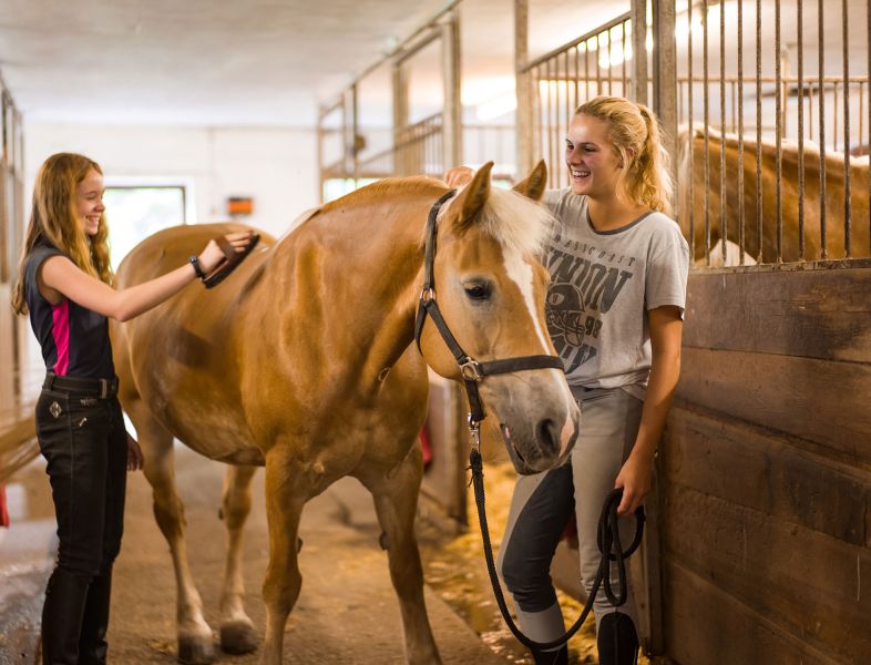 Vom ersten Kontakt bis zum sicheren Sitz: In der Reithalle trainieren Sie mit unseren Lehrern (auf Anfrage auch im Winter). Dazu kommen tägliche, geführte Ausritte abseits vielbefahrener Straßen. Für besondere Momente sorgen Frühstücksritt oder Almritt – und für Kinder Ponyreiten und -führen auf Anfrage.