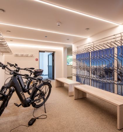 Auch an unsere sportlichen Gäste haben wir gedacht: Im Winter sorgt unser neuer Ski-Raum für wohlig warme Skischuhe, im Sommer finden E-Bikes ihren Platz - inklusive Lademöglichkeit. Auch sonstiges Freizeit- und Reitequipment kann hier deponiert werden. Jedes Zimmer hat seinen eigens reservierten Platz.
