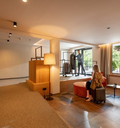 Unser neuer Eingangsberich im Untergeschoss ermöglicht eine komfortable Anreise. Obendrein macht er auch einiges her - so wie die ebenfalls neu gestaltete Billiard-Lounge in warmen Naturtönen gestaltet verbreitet er schon bei der Anreise den Charme des Haflingerhofs.
